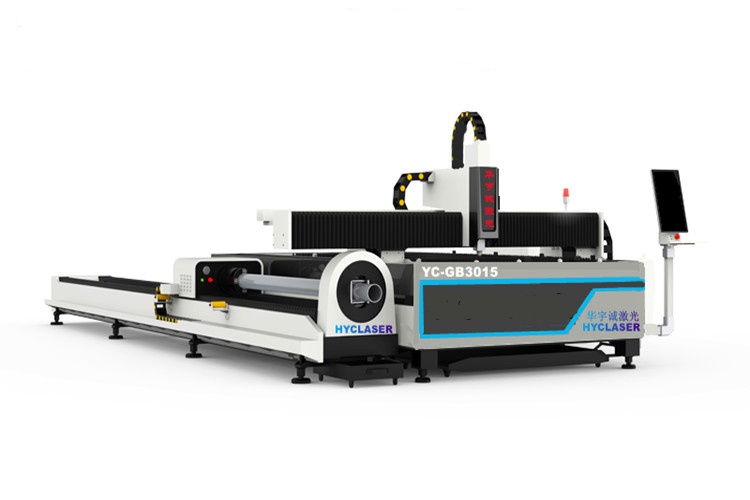 YC-GQ3015-G系列管板一體光纖激光切割機針對同時需求板材切割與管材切割客戶推出的板管一體光纖激光切割設備(管板兩用激光切割機|管板兩用金屬光纖激光切割機|管材激光切割機)。具有性能穩定、高效節能、性價比高等優點。YC-GQ3015-G專業切割方管、圓管、矩形管、D型管和六邊形管等各類型管材,方管□20*20 - □100*100mm,圓管Φ20-Φ150mm,管壁厚度0.5-5mm碳鋼管,0.5-3mm不銹鋼管;切割0.5~12mm碳鋼板,0.5~5mm不銹鋼板,0.5~3mm黃銅,0.5~2mm紫銅及鍍鋅板、電解板、硅鋼等多種金屬材料(厚度以及材料與激光器有關)